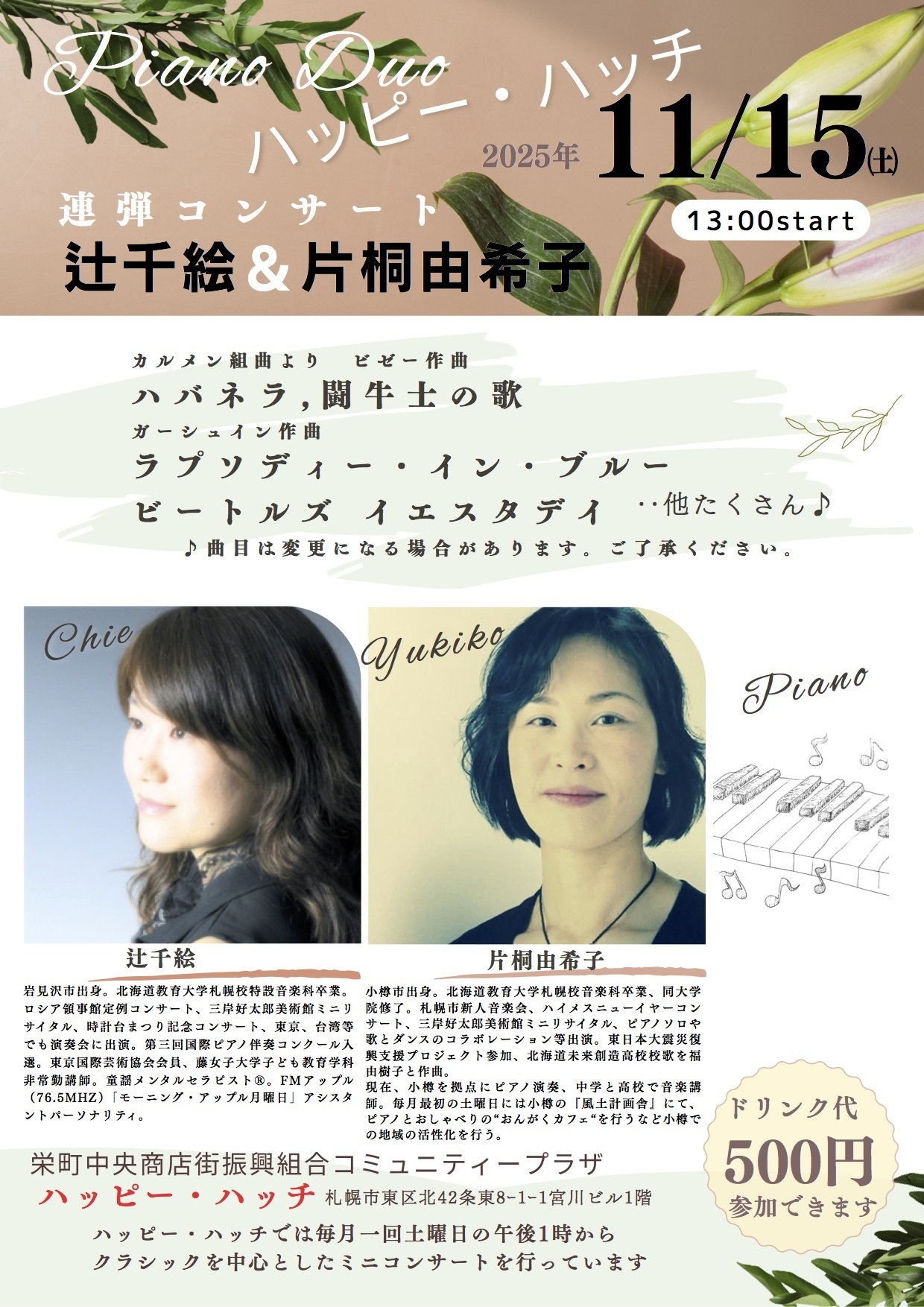 毎週月曜日 9:10~9:20 77.6Mhz FMップルで放送の「モーニングアップル月曜日」の中のⅠコーナーとして辻千絵の演奏が聞けます。