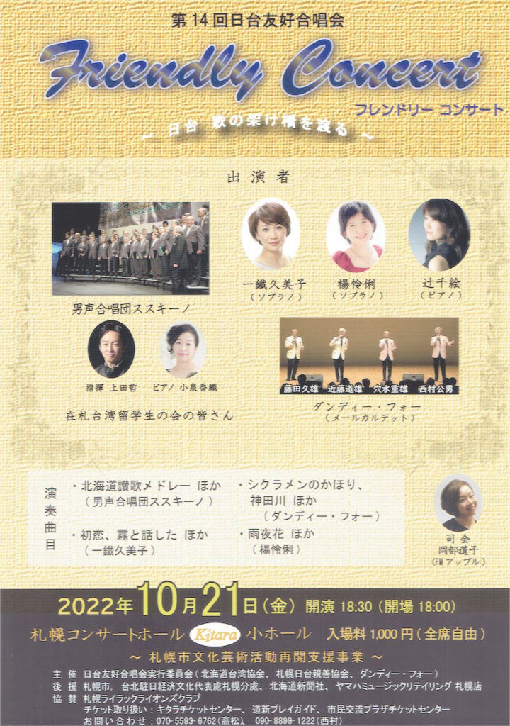 2022 10/21(金)第14回日台友好合唱会 フレンドリーコンサート〜日台 歌の架け橋を渡る〜