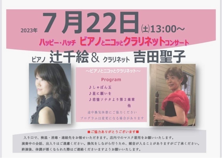 7/22(土)ハッピーハッチ ピアノとニコっとクラリネットコンサート