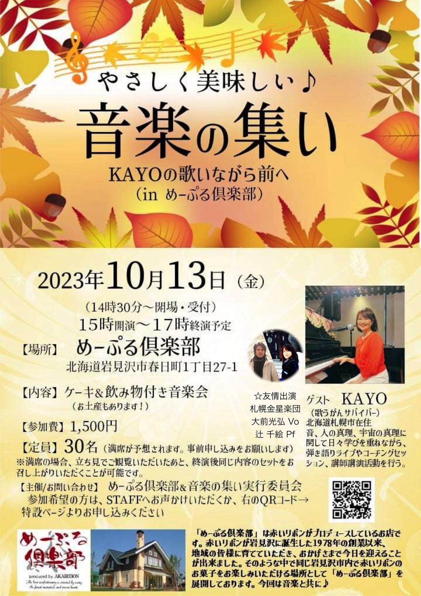 10/13(金)やさしく美味しい♪音楽の集い KAYOの歌いながら前へ(in めーぷる倶楽部)