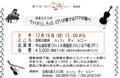 | 出演 | ゆきえトリオ Vn中山由紀恵 Vn小島盛史 Pf辻千絵 |